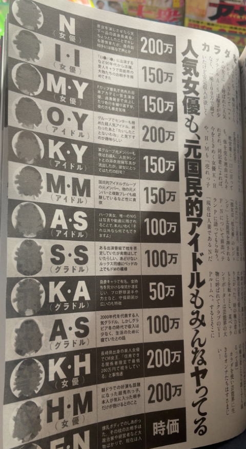 アイドル、女優、女性タレントの枕営業セックス相場一覧表、5ちゃんねるに定期的に上がりますが、あれって、10年くらい前のですよね。しかし、今回、実話ナックルズで、その最新版が出ました!イニシャルなので、誰なのかは、想像してもらうしかないですが、イニシャルだけでも、誰かなんとなく察してしまいますね!