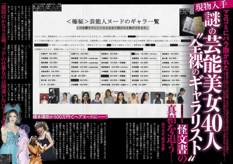 実話ナックルズに「<極秘>芸能人ヌードのギャラ一覧」という怪文章が送られてきたようです。橋本環奈、広瀬すずら誰もが知ってる超大物女性芸能人を脱がせる事が出来るという事で、そのギャラが詳細に書かれています。しかし、ハシカンだけじゃなく綾瀬はるか、深田恭子みたいな大物500万円と書いてあり、確かに500万円は大金ですが、これだけの大物芸能人が500万円で脱ぐかなという気も。また篠田麻里子、加護亜依だとヌードじゃなくMUTEKIと書いてあり、つまりAVデビューさせる事が出来るという事みたいですが、これが本物なら500万円くらい余裕で出す熱烈なファンがいそうですけどね~。
