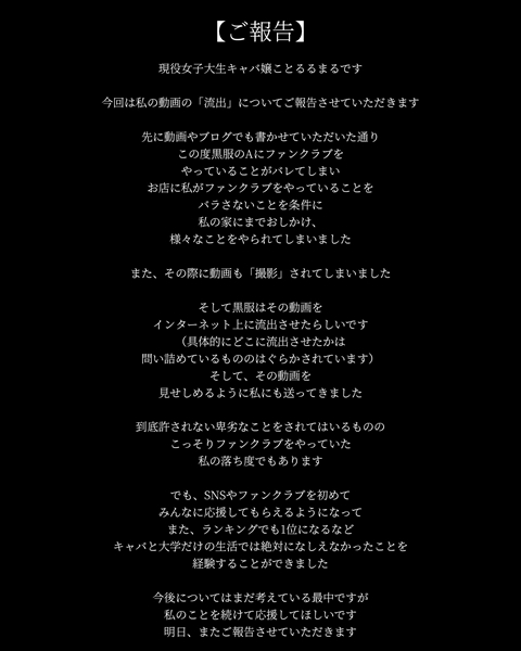 フォロワーが1万3千人というキャバ嬢インフルエンサー、るる(るるまる)が、自分の動画がネットに流出した事を報告しています。お店に内緒でファンクラブを作ってネットで活動してる事を黒服に見つかり、お店に黙っている事を条件に家に来て、恐らくハメ撮りなどのエロ動画を撮影されたそうです。そして、その動画をネットに流出させられたようですが、許せない黒服ですね。