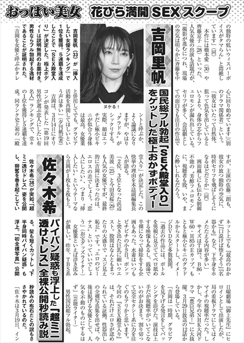 吉岡里帆がSEX殿堂入りしたという記事が週刊実話に掲載されていました。そもそもSEX殿堂入りなんてあったかなと思いましたが、記事によると、オリコンの「恋人にしたい有名人ランキング」で5年連続1位になった事を受け、新垣結衣に続き2人目の殿堂入りしたというニュースが、何故か週刊実話の記事では途中から「SEX殿堂入り」した事にすり替わっていた事が判明。編集部はチェックしておかしいと思わなかったんですかね?